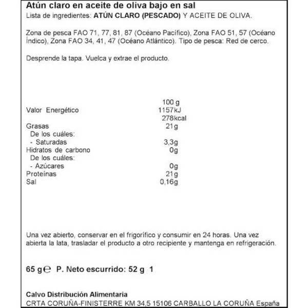 Atún Claro en aceite de oliva sin sal añadida, en paquete de 3 latas de 65 g cada una. Una conserva de pescado muy consumida en ensaladas, bocadillos, empanadillas, platos de pasta, etc.