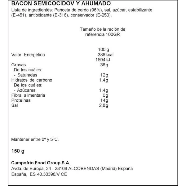 Panceta de cerdo (96%), sal, azúcar, estabilizador (E-451), antioxidante (E-316), conservador (E-250).