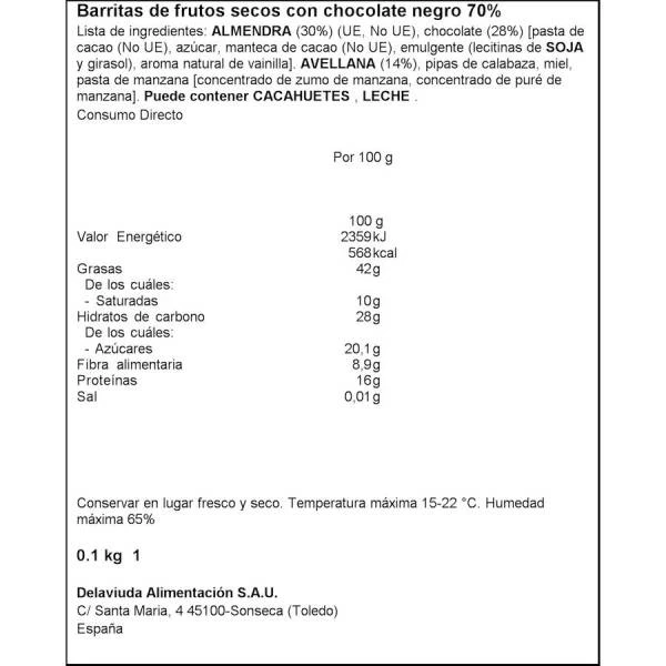 Almendra (UE y no UE) 30%, chocolate 28% (pasta de cacao (no UE), azúcar, manteca de cacao (no UE), emulgente: lecitina de soja y girasol, aroma natural de vainilla), avellana 14%, pipas de calabaza, miel, pasta de manzana (concentrado de zumo de manzana y concentrado de puré de manzana). Cacao min. 70% en el chocolate. Puede contener cacahuetes y leche.