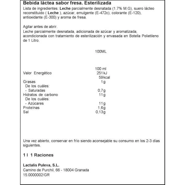 Leche parcialmente desnatada (1,7% M.G.), suero lácteo reconstituido (leche), azúcar, emulgente (E472c), colorante (E120), antioxidante (E300), aroma de fresa.