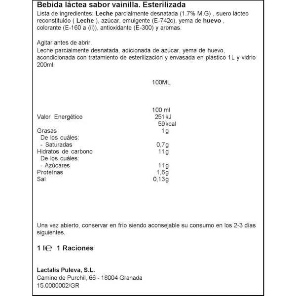 Leche parcialmente desnatada (1,7% M.G.), suero lácteo reconstituido (leche), azúcar, emulgente (742c), yema de huevo, colorante (E160a(ii)), antioxidante (E300), aromas.
