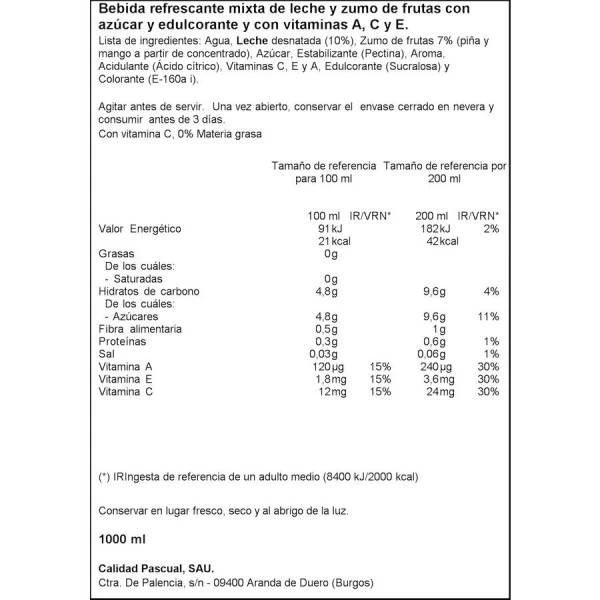 Agua, leche desnatada (10%), zumo de frutas 7% (piña y mango a partir de concentrado), azúcar, estabilizante (pectina), aroma, acidulante (ácido cítrico), vitaminas A, C y E, edulcorante (sucralosa) y colorante (E160ai).