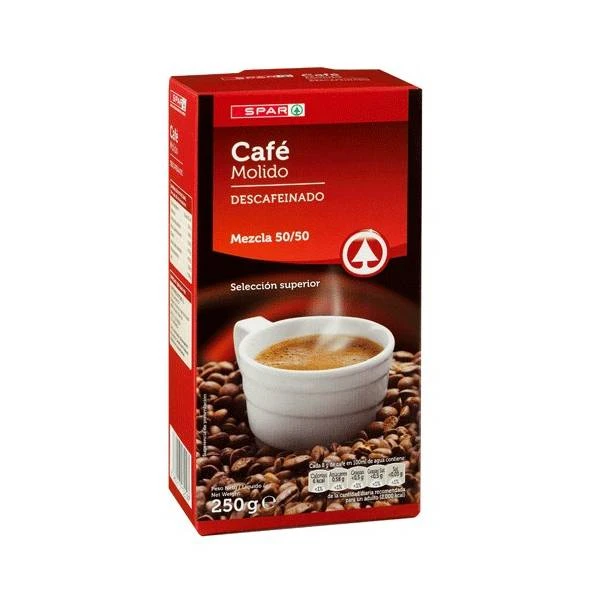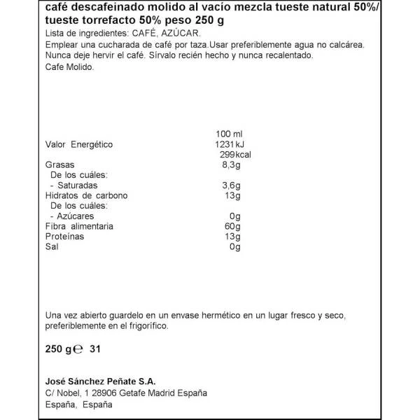 - Especificaciones: envasado al vacío. Café descafeinado molido de tueste natural (50%) y torrefacto (50%).