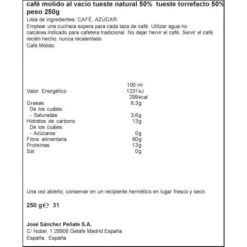 - Especificaciones: envasado al vacío. Café molido de tueste natural (50%) y torrefacto (50%).