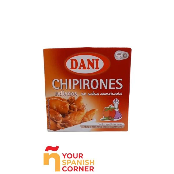 Chipirones, agua, aceite de girasol, tomate, cebolla, sal, azúcar y especias. Puede contener pescado y crustáceos.