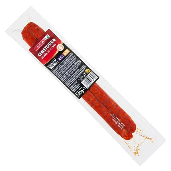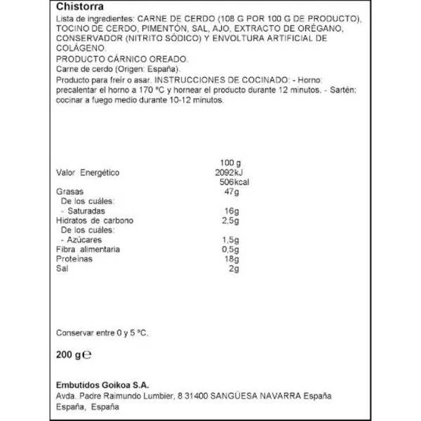Carne de cerdo (108 g por 100 g de producto) (origen España), tocino de cerdo, pimentón, ajo, extracto de orégano, conservador (nitrito sódico), y envoltura artifical de colágeno. Producto cárnico oreado.