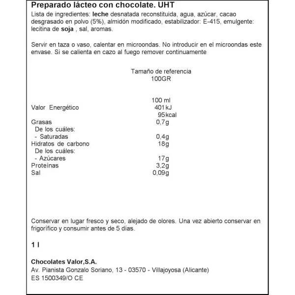 Leche desnatada reconstituida, agua, azúcar, cacao desgrasado en polvo (5%), almidón modificado, estabilizador (E415), emulgente (lecitina de soja), sal, aromas.