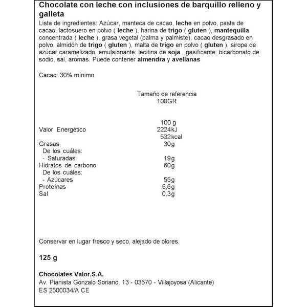 Azúcar, manteca de cacao, leche en polvo, pasta de cacao, lactosuero en polvo (leche), harina de trigo (gluten), mantequilla concentrada (leche), grasa vegetal (palma y palmiste), cacao desgrasado en polvo, almidón de trigo (gluten), malta de trigo en polvo (gluten), sirope de azúcar caramelizado, emulsionante: lecitina de soja, gasificante: bicarbonato de sodio, sal, aromas. Cacao: 30% mínimo. Contine trazas de almendra y avellana.