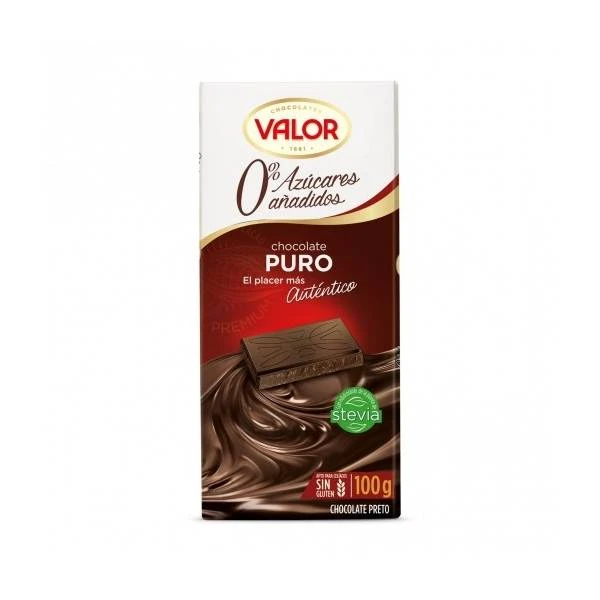 Tableta del mejor chocolate Valor, un chocolate puro sin azúcar añadido. Disfruta de unos de los placeres de la vida sin preocuparte por el azúcar.