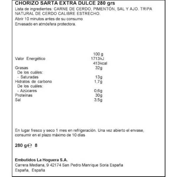 El chorizo dulce es un producto típico español, que se consume como aperitivo compartiéndolo con los amigos o familiares. Este producto no tiene gluten.