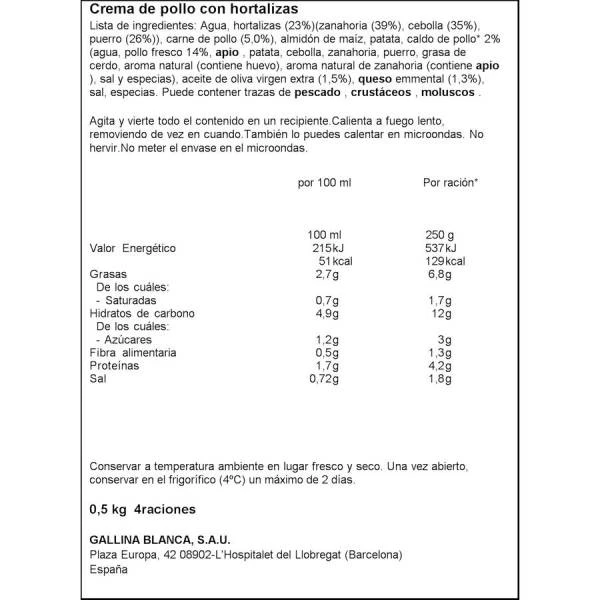 Agua, hortalizas 22% (cebolla 38%, puerro 31%, zanahoria 31%), carne de pollo 7%, patata, almidón de maíz, caldo de pollo 2% (agua, pollo fresco 14%, apio, patata, cebolla, zanahoria, puerro, grasa de cerdo, aroma natural (contiene huevo), aroma natural de zanahoria (contiene apio), sal y especias), queso, aceite de oliva virgen extra 1,5% y sal. Puede contener trazas de pescado, crustáceos y moluscos.