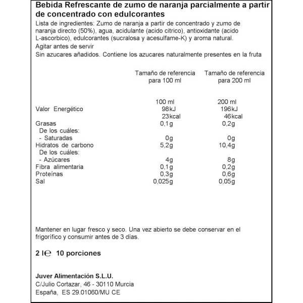 Zumo de naranja a partir de concentrado y zumo de naranja directo (50%), agua, acidulante (ácido cítrico), antioxidante (ácido L-ascórbico), edulcorantes (sucralosa y acesulfame-K) y aroma natural.