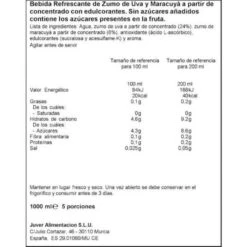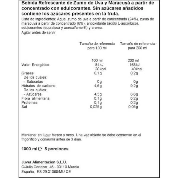 Agua, zumo de uva a partir de concentrado (24%), zumo de maracuyá a partir de concentrado (6%), antioxidante (ácido L-ascórbico), edulcorantes (sucralosa y acesulfame-K), aroma.