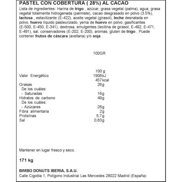 Harina de trigo, azúcar, grasa vegetal (palma), agua, grasa vegetal totalmente hidrogenada (palmiste), cacao desgrasado en polvo (3,5%), estabilizante (E 422), aceite vegetal de girasol, leche desnatada en polvo, huevo líquido pasteurizado, lactosa, yema de huevo en polvo, gasificantes (E 500, E 450, E 341), dextrosa, emulgentes (lecitina de girasol, E 492, E 471, E 491), sal, conservadores (E 202, E 200), aromas y gluten de trigo. Puede contener trazas de avellana y soja.