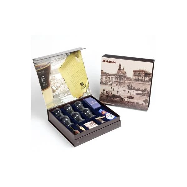 Estupenda caja con 6 copas de café asiático, un producto típico de Cartagena. Elabora tu propio café siguiendo las instrucciones que aparecen en el contenido de la caja.