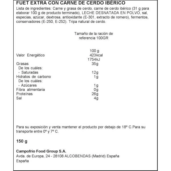 Carne y grasa de cerdo, carne de cerdo ibérico (47 g para elaborar 100 g de producto terminado), leche en polvo, sal, especias, azúcar, dextrosa, antioxidantes (E-301, E-392), conservadores (E-252, E-250), fermentos, colorante (E-120). Puede contener trazas de proteína de soja.