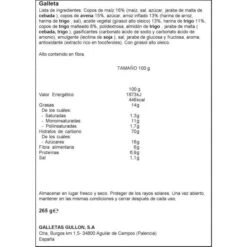 Copos de maíz 16% (maíz, sal, azúcar, jarabe de malta de cebada), copos de avena 14,5%, azúcar, arroz inflado 13,5% (harina de arroz, harina de trigo, sal), aceite vegetal (girasol alto oleico), harina de trigo 11%, copos de trigo malteado 8,5%, fibra vegetal, almidón de trigo, jarabe de malta (cebada), gasificantes (bicarbonatos sódico y amónico), emulgente: lecitina de soja, sal, jarabe de glucosa y fructosa, aroma vainilla. Con girasol alto oleico.