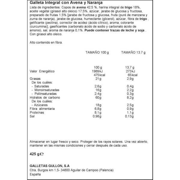 Copos de avena, harina integral de trigo, aceite vegetal (girasol alto oleico), azúcar, jarabe de glucosa y fructosa, preparado de frutas (jarabe de fructosa y glucosa, fruta (puré de manzana y zumo de naranja), jarabe de glucosa, humectante (glicerol), azúcar, fibra de trigo, gelificante (pectina), corrector de acidez (ácido cítrico), aroma, colorante (curcumina)), gasificantes (carbonato ácido de sodio y carbonato ácido de amonio), sal, aroma de naranja. Puede contener trazas de leche y soja.