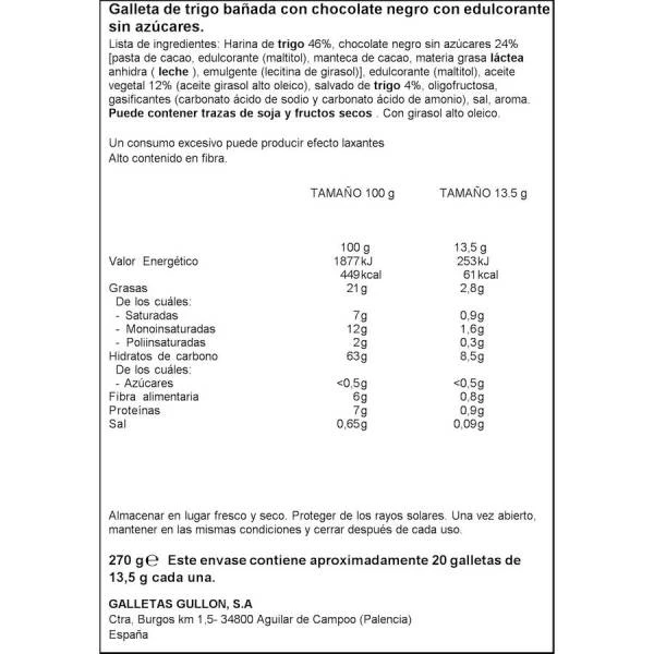 Harina de trigo 46%, chocolate negro sin azúcares 24% [pasta de cacao, edulcorante (maltitol), manteca de cacao, materia grasa láctea anhidra (leche), emulgente (lecitina de girasol)], edulcorante (maltitol), aceite vegetal 12% (aceite girasol alto oleico), salvado de trigo 4%, oligofructosa, gasificantes (carbonato ácido de sodio, carbonato ácido de amonio), sal, aroma. Puede contener trazas de soja y frutos secos.