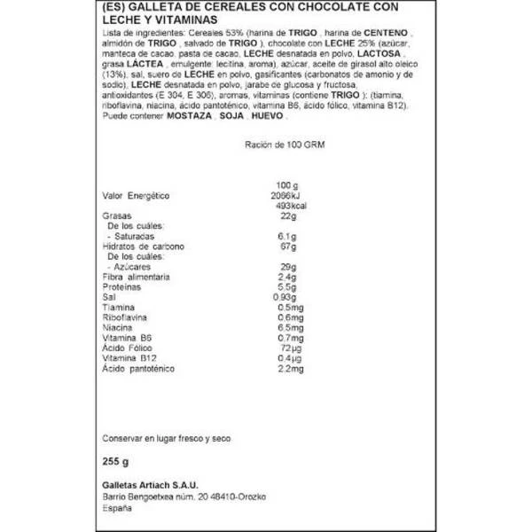 Cereales 53% (harina de trigo, harina de centeno, almidón de trigo, salvado de trigo), chocolate con leche 25% (azúcar, pasta de cacao, manteca de cacao, leche desnatada en polvo, lactosa, grasa láctea, emulgente: lecitina de girasol, aroma), azúcar, aceite de girasol alto oléico 13%, sal, suero de leche en polvo, gasificantes (bicarbonatos amónico y sódico), leche desnatada en polvo, jarabe de glucosa y fructosa, antioxidantes (E-304 y E-306), aroma, vitaminas (contiene trigo): tiamina, riboflavinado fólico, vitamina B12. Puede contener mostaza, soja, huevo.