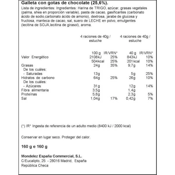 Harina de TRIGO, azúcar, grasa de palma, pasta de cacao, manteca de cacao, gasificantes (bicarbonato de amonio, bicarbonato de sodio, fosfato monocálcico), dextrosa, jarabe de glucosa y fructosa, sal, suero de LECHE en polvo, emulgentes (lecitina de SOJA, lecitina de girasol), aroma.