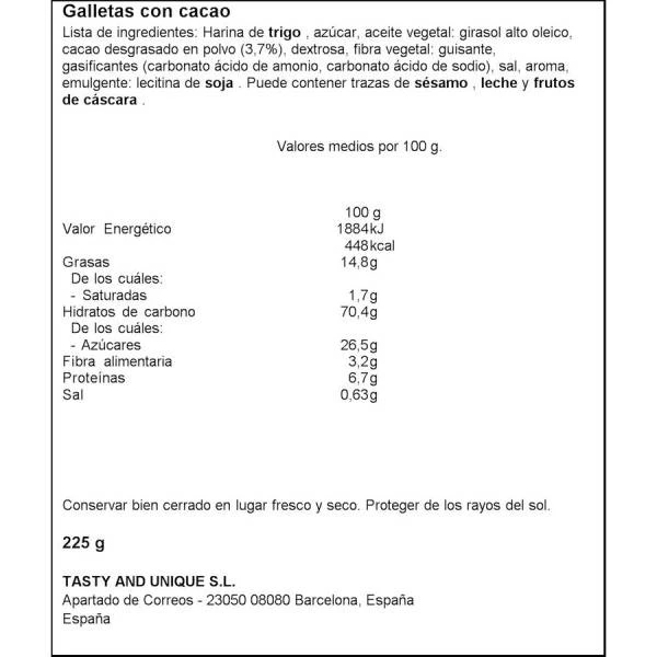 Harina de trigo, azúcar, aceite vegetal de palma, cacao desgrasado en polvo (4%), dextrosa, fibra vegetal: guisante, suero lácteo en polvo, sal, gasificantes: carbonato ácido de sodio, difosfatos, aroma emulgente: lecitina de soja. Puede contener trazas de sésamo y frutos de cáscara.