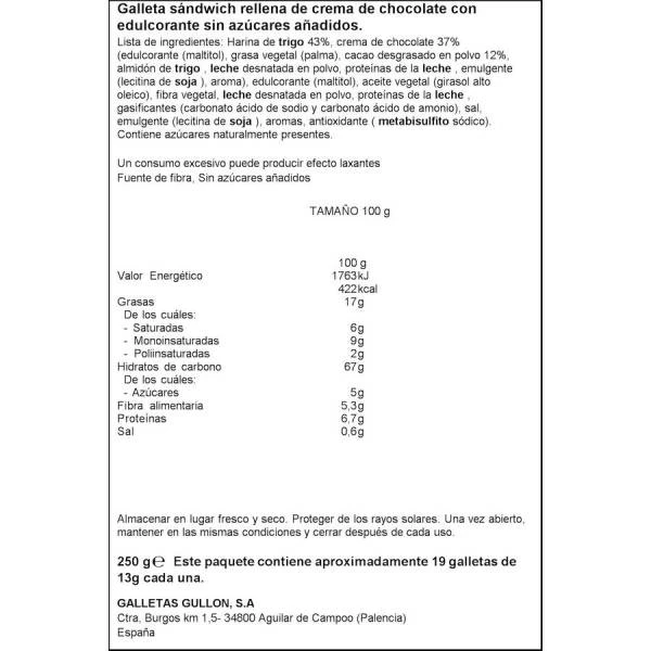 Galletas rellenas de chocolate sin azúcares añadidos. Compra estas galletas tipo sándwich para el desayuno o merienda. Es un producto ideal para diabéticos.
