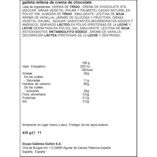 Harina de trigo, crema de chocolate 37 %, cacao en polvo 15 %, almidón de trigo, emulgente: lecitina de soja, aroma de vainilla, jarabe de glucosa y fructosa, grasa vegetal de palma, azúcar, gasificantes, derivado lácteo en polvo, sal, emulgente: lecitina de soja, antioxidante.