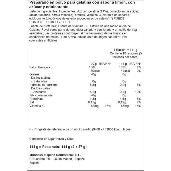 Paquete con sobres para preparar gelatina con sabor a limón. Es muy utilizada en postres o para repostería y además está enriquecida con vitamina C.