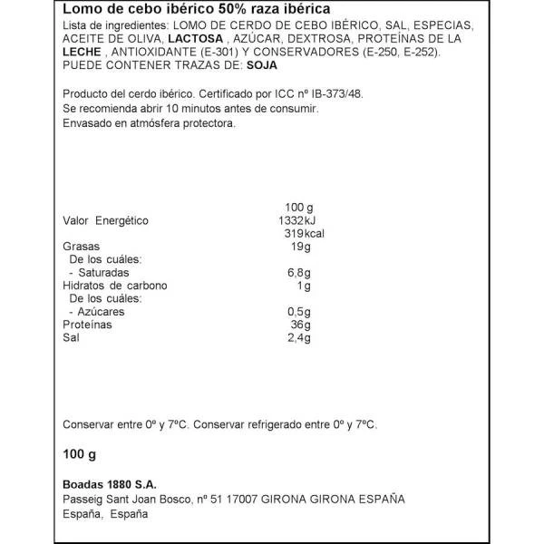 Lomo de cerdo de cebo ibérico, sal, especias, aceite de oliva, (E-301) y conservadores (E-250, E-252).