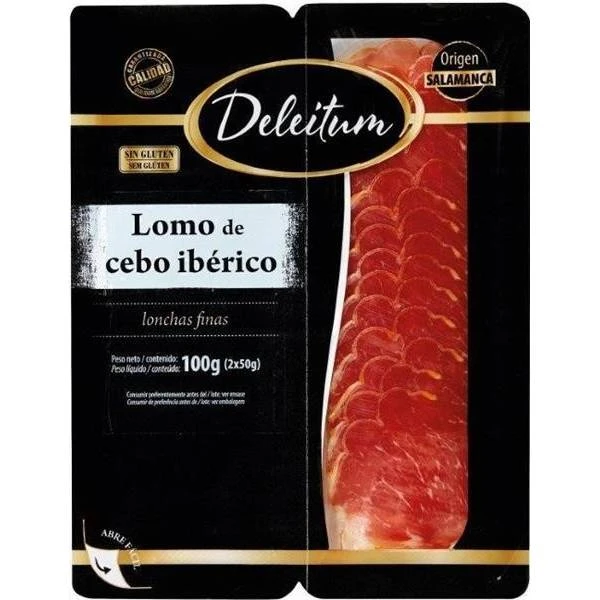 Lomo de cebo ibérico 50 % raza ibérica de Salamanca en lonchas finas y envasado en dos packs de 50 g, de la marca DELEITUM.