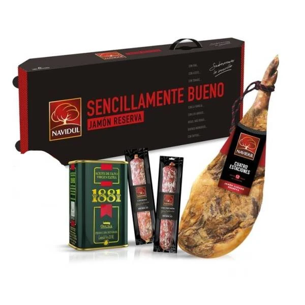 Este conjunto incluye un Jam贸n Reserva 4 Estaciones de 7 kg, Chorizo Navidul Gran Selecci贸n y Salchich贸n Navidul Gran Selecci贸n, todos cuidadosamente elaborados para resaltar la autenticidad y calidad. Adem谩s, la lata de Aceite de Oliva Virgen Extra 1881 a帽ade un toque final de exquisitez, convirtiendo este lote en el regalo perfecto para disfrutar de la gastronom铆a espa帽ola en su m谩xima expresi贸n.