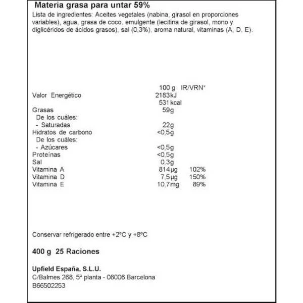 Aceites vegetales (nabina, girasol en proporciones variables), agua, grasa de coco, emulgente (lecitina de girasol, mono y diglicéridos de ácidos grasos), sal (0,3%), aroma natural, vitaminas (A, D, E).