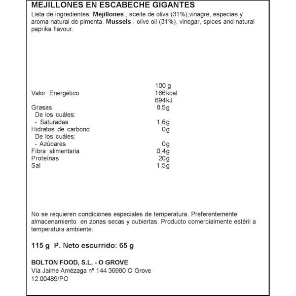Mejillones, aceite de oliva (31%), vinagre, especias y aroma natural de pimentón. Puede contener trazas de crustáceos.