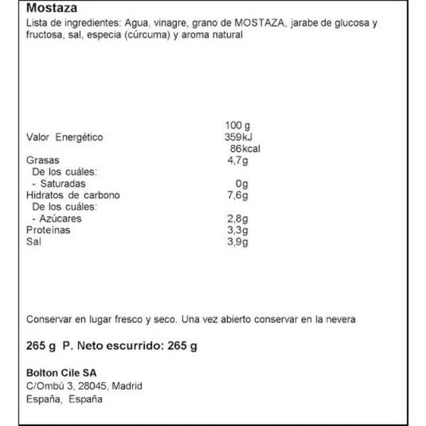 Agua, vinagre, grano de MOSTAZA, jarabe de glucosa-fructosa, sal, especia (cúrcuma), aroma natural.
