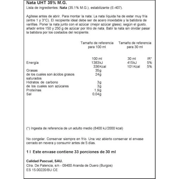 Esta nata de Pascual es perfecta para montar e incluso cocinar, prepara tus mejores postres y recetas: nata con fresas, tartas, pasteles… Con 35% de grasa, ideal para montar y cocinar.