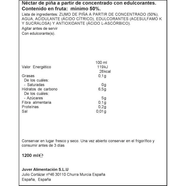 Zumo de piña a partir de concentrado (50%), agua, acidulante (ácido citrico), antioxidante (ácido L-ascórbico) y edulcorantes (Sucralosa y Acesulfamo K).