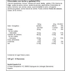 Azúcar, manteca de cacao, leche, galleta (13%) (harina de trigo, grasa de palma, azúcar, jaraba de glucosa, gasificantes (carbonatos de sodio y de amonio), sal y aroma), cacao, suero de leche en polvo, emulgente (lecitina de girasol), aroma natural de vainilla. Puede contener frutos de cáscara.