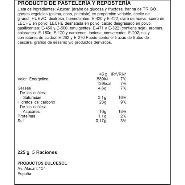 Azúcar, jarabe de glucosa y fructosa, harina de trigo, grasas vegetales (palma, coco, palmiste) en proporción variable, aceite de girasol, huevo, dextrosa, humectantes: E-420 y E-422, clara de huevo, suero de leche en polvo, leche desnatada en polvo, cacao desgrasado en polvo, gasificantes: E-450 y E-500, emulgentes: E-471 y E-322 (contiene soja), aromas, colorantes: E-160c, E-120 y carotenos, lactosa, conservador: E-202, sal y correctores de acidez: E-262 y E-270. Puede contener trazas de frutos de cáscara, granos de sésamo y/o productos derivados.