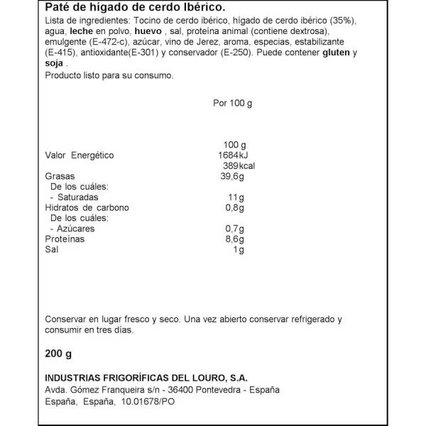 Tocino de cerdo ibérico, hígado de cerdo ibérico (35%), agua, leche en polvo, huevo, sal, proteína animal (contiene dextrosa), emulgente (E-472c), azúcar, vino de Jerez, aroma, especias, estabilizante (E-415), antioxidante (E-301) y conservado (E-250). Contiene huevo y derivados de leche. Puede contener gluten y soja.