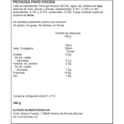Pechuga de pavo (62,5%), agua, sal, proteína de soja, dextrosa de maíz, azúcar, aromas, estabilizantes: (E-451, E-420 y E-407), antioxidantes: (E-331 y E-316) y conservador E-250. Puede contener trazas de proteína de leche.