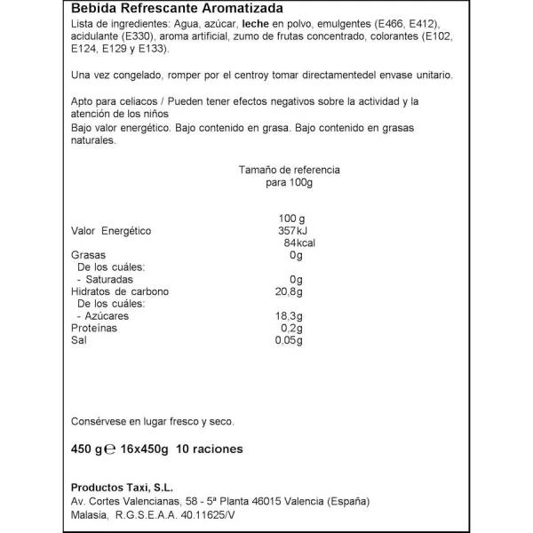 Agua, azúcar; leche en polvo, emulgentes (E-466,E-412), acidulante (E-330), aroma artificial, zumo de frutas concentrado, colorantes (E-102, E-129, E-133).