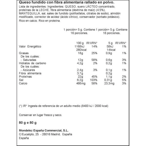 Queso, suero lácteo concentrado, proteínas de la leche, fibra alimentaria (dextrina de maíz) (4.5%), mantequilla, sal, sales de fundido (polifosfatos, citratos de sodio), almidón modificado, corrector de acidez (ácido cítrico), conservador (sorbato potásico).