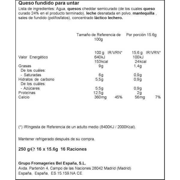Agua, quesos (de los cuales semicurado 24% en el producto final), leche desnatada en polvo, sales de fundido: polifosfatos, concentrado lácteo, mantequilla.