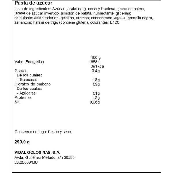 Azúcar, jarabe de glucosa y fructosa, grasa de palma, jarabe de azúcar invertido, almidón de patata; humectante (glicerina), gelatina, acidulante (ácido tartárico), aromas; concentrado vegetal (grosella negra, zanahoria), harina de trigo (contiene gluten), colorante (E120). Puede contener trazas de leche.