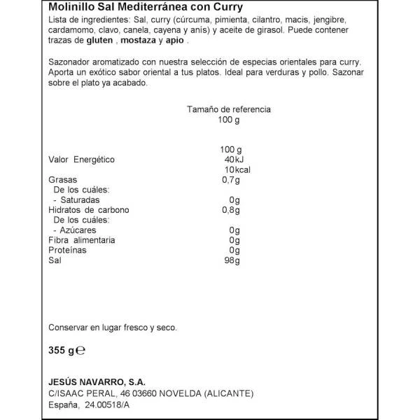 Sal, curry 1,5% (cúrcuma, pimienta, cilantro, macis, jengibre, cardamomo, clavo, canela, cayena y anís) y aceite de girasol. Contiene trazas de gluten y mostaza.