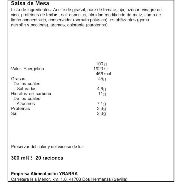 Aceite de girasol, puré de tomate, ajo, azúcar, vinagre de vino, proteínas de leche, sal, especias, almidón modificado de maiz, zumo de limón concentrado, conservador (sorbato potásico) estabilizantes (goma garrofín y pectinas) aromas, colorante (carotenos). Sin gluten.