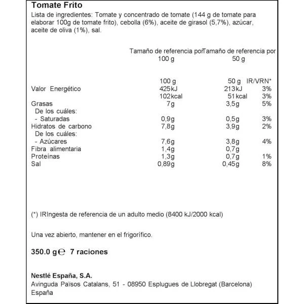 Tomate y concentrado de tomate (144 g de tomate para elaborar 100g de tomate frito), cebolla (6%), aceite de girasol (5,7%), azúcar, aceite de oliva (1%), sal.