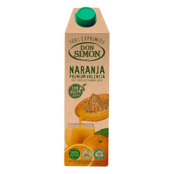 Zumo de naranja elaborado a partir de las mejores naranjas de Valencia. Un zumo con pulpa y sabor 100% natural, rico en vitamina C. Disfruta de este delicioso zumo Premium con Don Simón.
